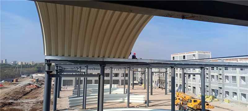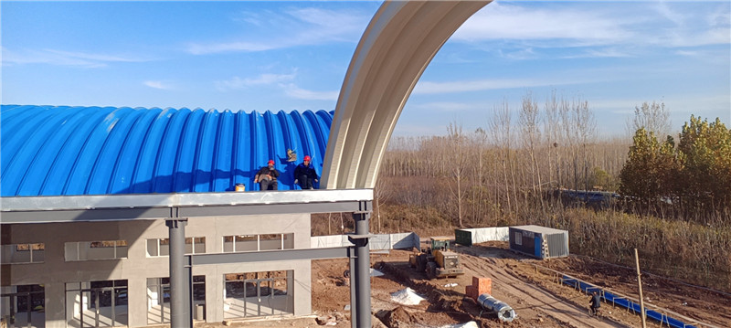 屋頂采用的板材為TS280GD-Z高強(qiáng)度鍍鋅鋼板,厚度1.0mm,寬度914mm,具備良好的抗腐蝕性與強(qiáng)度。結(jié)構(gòu)設(shè)計(jì)按照矢跨比0.2進(jìn)行合理拱形設(shè)計(jì),有效提高了屋面的排水能力和抗風(fēng)能力。
