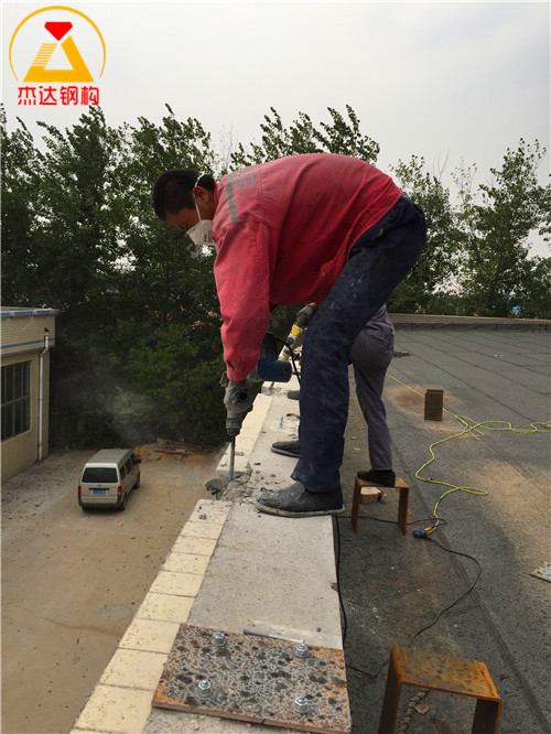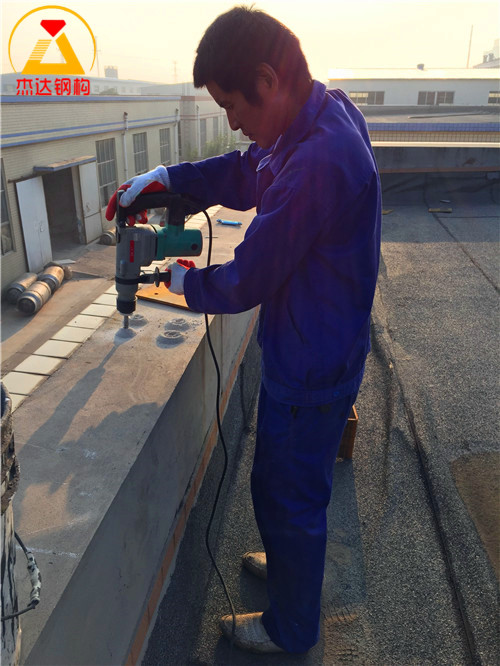 穿墻預埋件通常沿墻體頂端均勻間隔布置,配合膨脹螺栓或化學螺栓加固固定。此工藝主要解決在原有建筑沒有預留預埋件情況下的施工需求,常見位置包括水槽邊或圈梁部位。以下圖片來自江蘇杰達鋼結構工程有限公司在山東濰坊馳騁實業(yè)有限公司倉間罩棚施工現(xiàn)場,展示了穿墻預埋件的具體施工過程。