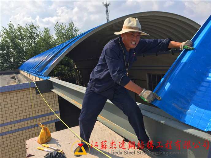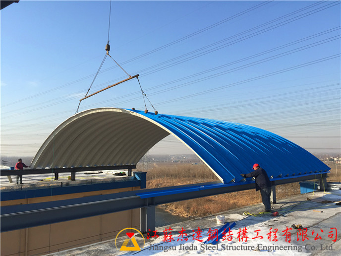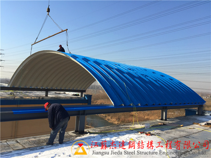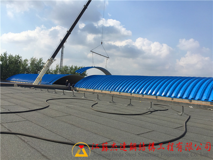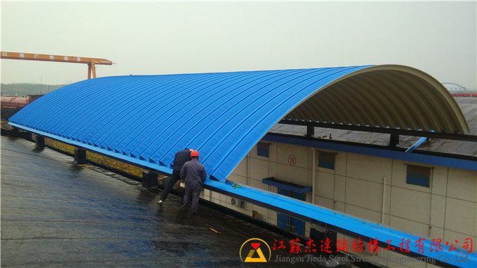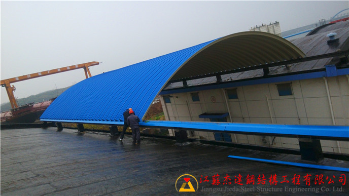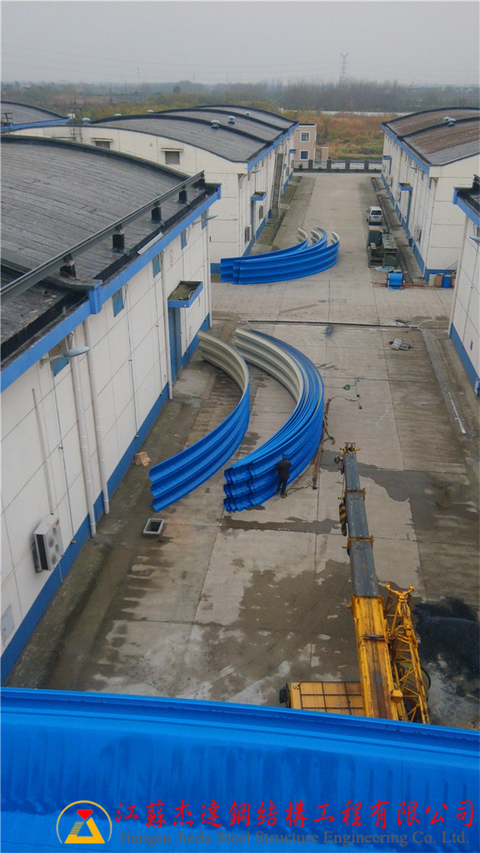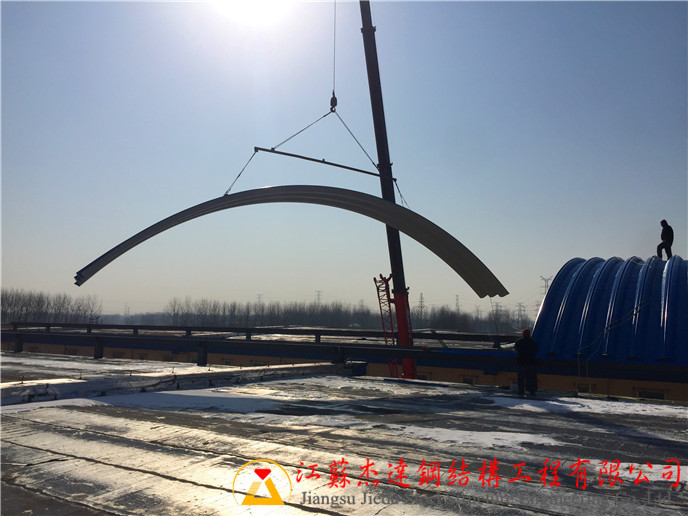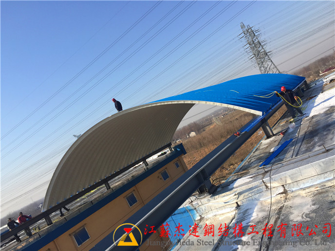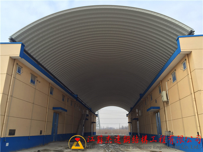 江蘇杰達鋼結構工程有限公司承建的過道式拱形屋頂,主要用于堆放物料和設備。該結構設計能夠在陰雨天氣下為糧食儲備庫提供良好的保護環(huán)境,確保設備和物資的安全存放與使用。