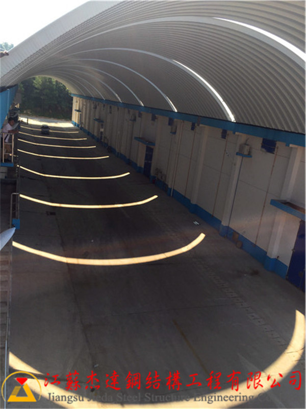 福建省光澤直屬庫倉間罩棚項(xiàng)目采用拱形屋頂結(jié)構(gòu)設(shè)計(jì),結(jié)合現(xiàn)代彩鋼材料,實(shí)現(xiàn)了較大的跨度和實(shí)用的建筑空間,適應(yīng)倉庫功能需求。