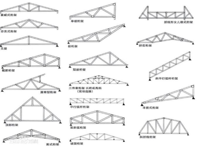 從力學(xué)方面分析,桁架外形與簡支梁的彎矩圖相似時,上下弦桿的軸力分布均勻,腹桿軸力小,用料很??;從材料與制造方面分析,木桁架做成三角形,鋼桁架采用梯形或平行弦形,鋼筋混凝土與預(yù)應(yīng)力混凝土桁架為多邊形或梯形為宜。