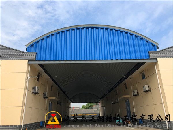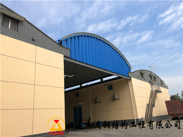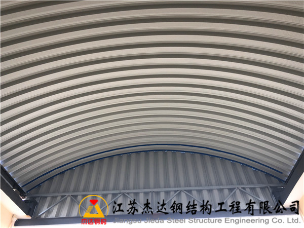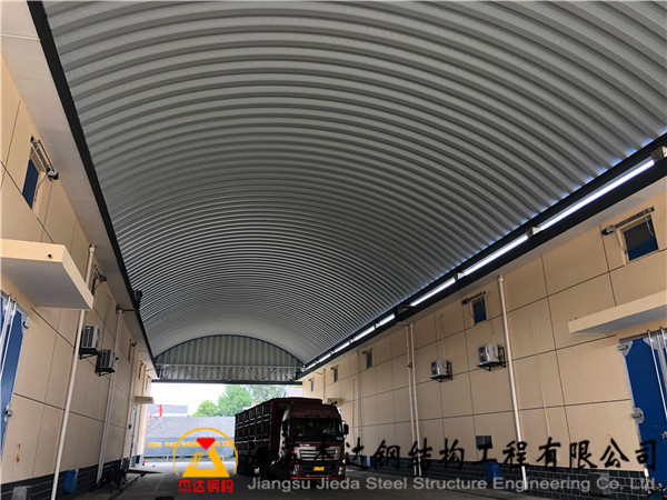該項(xiàng)目位于江蘇省南京市浦口區(qū)糧食儲(chǔ)備庫內(nèi),罩棚跨度達(dá)16米,長度60米,采用拱形波紋鋼屋蓋結(jié)構(gòu)。結(jié)構(gòu)兩側(cè)設(shè)有250*250H型鋼,上方焊接托板,配合兩側(cè)桁架支撐。桁架外側(cè)覆蓋了通過壓制成型的拱形瓦片,用作山墻,增強(qiáng)整體穩(wěn)定性與美觀度。